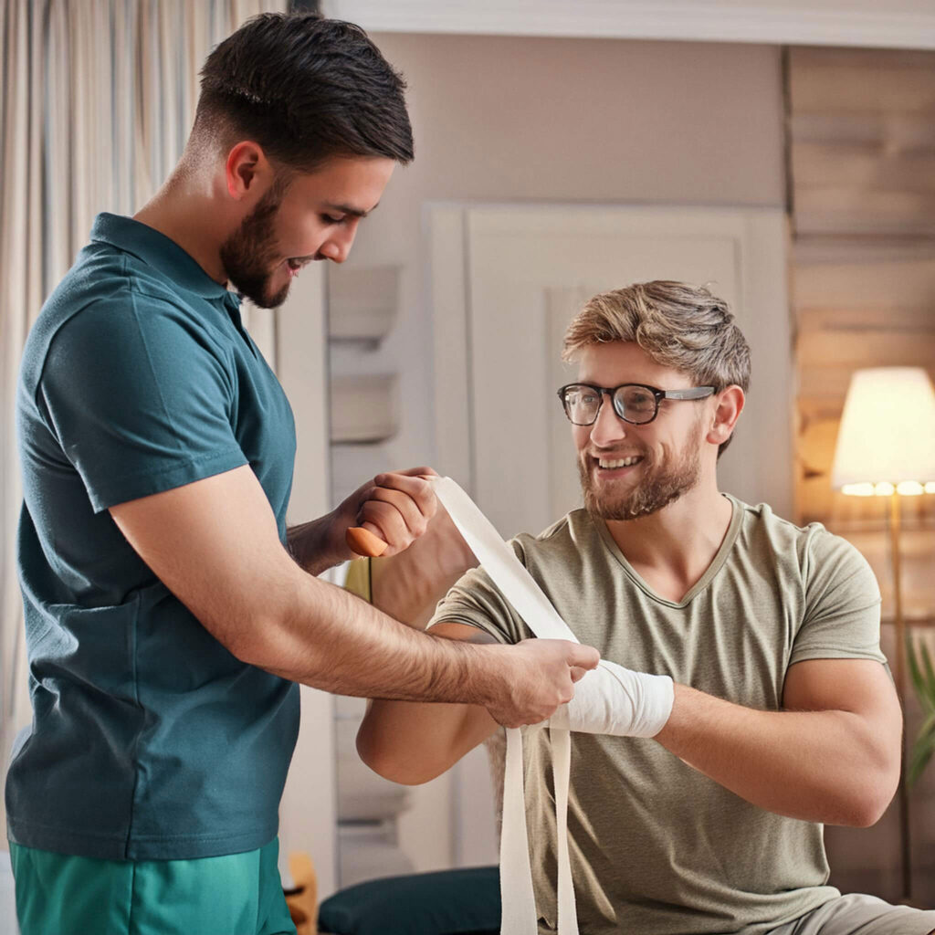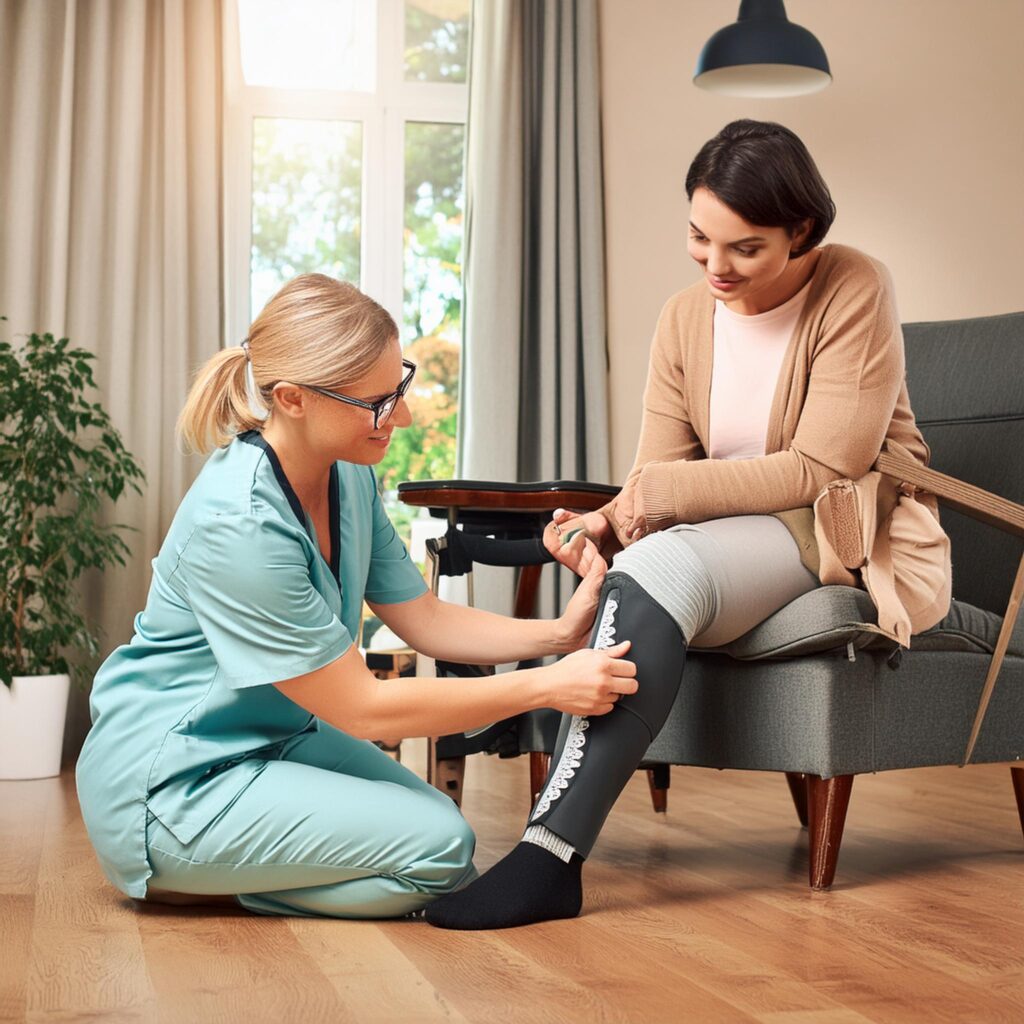 Das Anlegen von Kompressionsstrümpfen sowie Kompressionsverbänden wird erforderlich, um Wasseransammlungen z.B. nach operativen Eingriffen vorzubeugen.